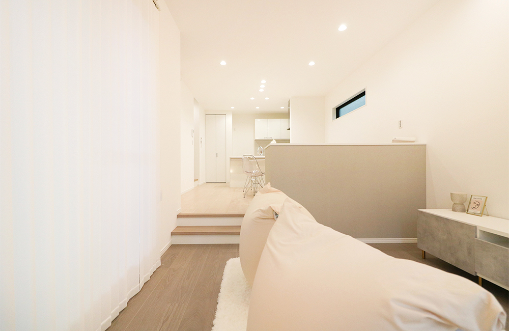 こちらのお家は、ダイニングとリビングがスキップフロアで分けられていて、
