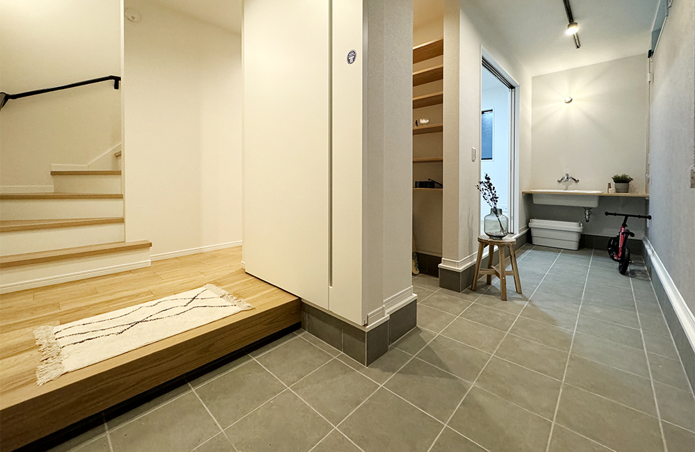 玄関ドアを開けると、一直線に伸びた広々土間収納が出迎えてくれます!
