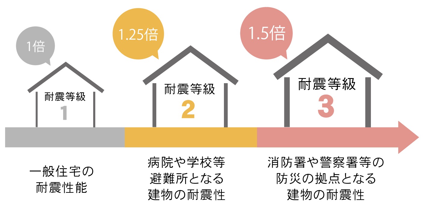 対象の建物がどのくらい地震に耐えられるかを、3段階に分けて評価します。数字が上がるほど耐震性が高いため、これから家を建てるなら地震に対してもっとも安全な耐震等級3レベルを目指しましょう。