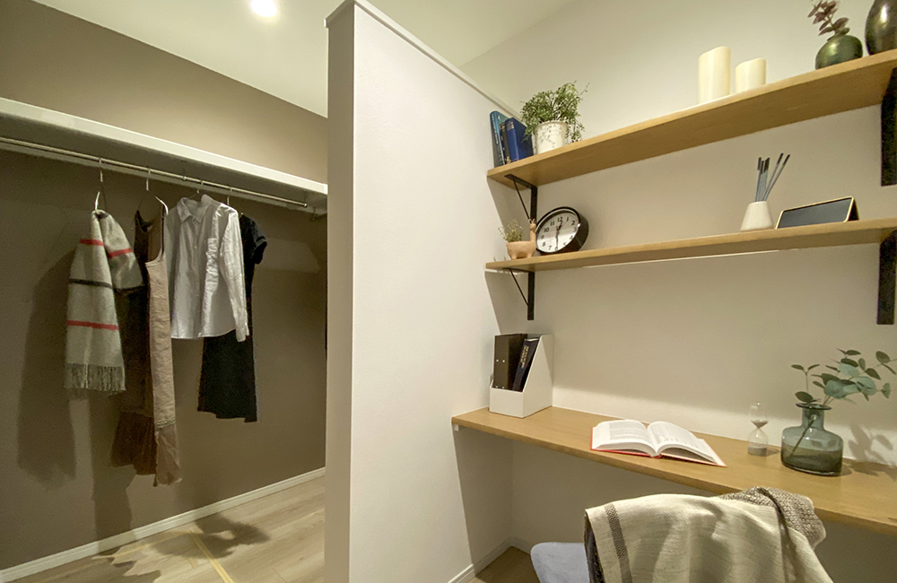 1階の主寝室には、リモートワークや趣味に集中できる程よい広さの書斎を設けました。家で仕事をする時など、ご家族と距離を置いて、静かな時間を過ごせる空間です。スムーズに出入りができるよう扉をあえて設けず、ゆるやかな独立性を確保しました。壁付けの可動棚は上部スペースを有効活用し、書籍や書類をスッキリと収納できます。