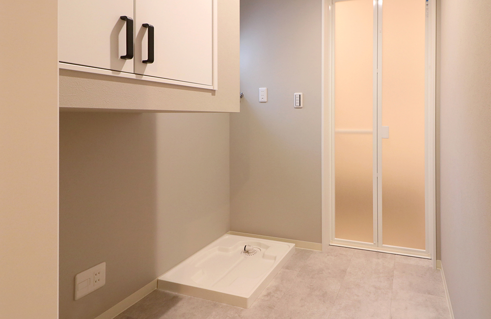 洗面スペースと分けた事で、使い勝手の良い脱衣室。吊収納の中にご家族の着替えやタオル、洗剤のストックを入れて置けるので、脱衣室をスッキリと整理整頓できます。吊収納下のスペースは、ランドリーボックスを置いて、脱いだ服を入れる場所として。またガスと電気のコンセントを設置し、パワフルなガス衣類乾燥機にも対応しています。
