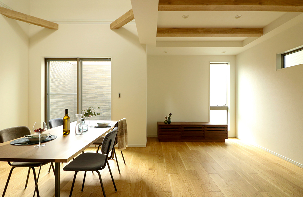 ダイニング上部には吹抜けを設けました。北向きながら、3階バルコニーの南面に面した窓から、陽光を取り込み、明るく開放的なLDKとなっています。空間演出するアクセントに間接照明を設け、シーリングファンや化粧火打ち梁も取り入れました。目にも楽しくオシャレで落ち着いた時間をお過ごし頂けます。