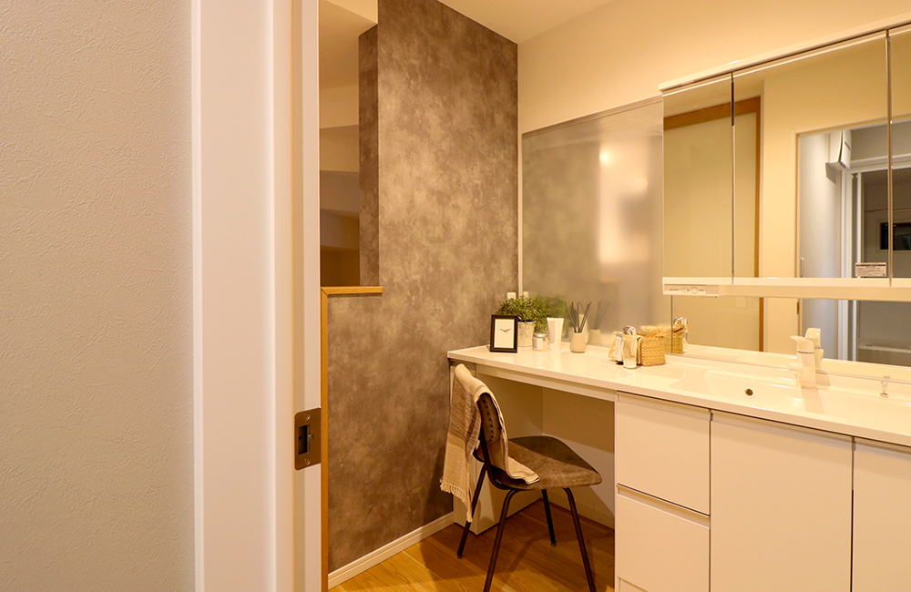 1階から上がってくる階段ホールの洗面スペース。帰宅時の手洗い習慣が自然と身につき、外出時の身支度もしやすいです。ワイドな洗面カウンターは、手荷物を置いたり、2人同時にも使えます。またイスに座ってゆったりとメイクや家事ができるのもうれしいポイントです♪脱衣室と分けた事で生活感が見えないので、お客様にも気兼ねなく使って頂けます。