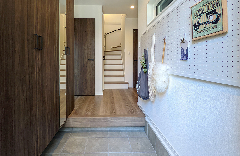 玄関壁面の有孔ボード。フックを取り付ければ、お気に入りのアイテムを飾れるディスプレイスペースに♪お出かけする時の、鍵や帽子・カバンをかけておいたり、お気に入りのアート作品・観葉植物などを飾れば、オシャレに楽しむ事ができます。