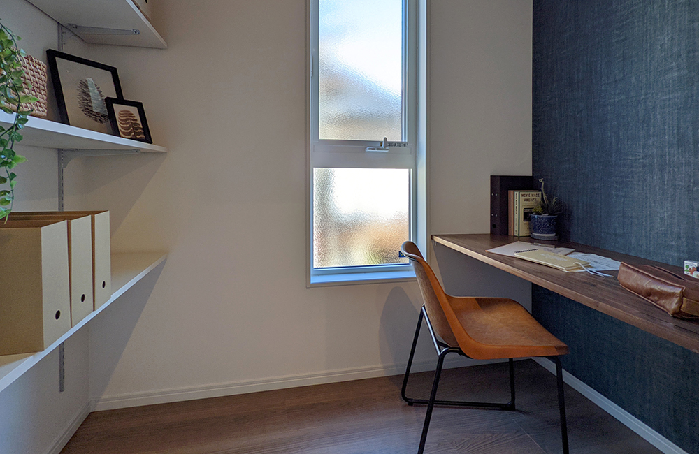 交通量の多い3車線の道路から近い敷地だったので、車の音を軽減する為、遮音性能に優れた樹脂窓と、真空トリプルガラスを採用しました。断熱性能の向上にもつながり、静かで快適に過ごして頂けます。壁面をムダなく使えるボードや、ファミリークローゼットを設け、収納にもこだわりました。3Fの将来間仕切りのある部屋は、ご家族の成長やライフスタイルの変化に対応できます。