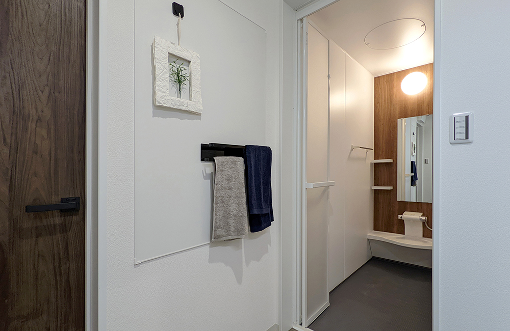 浴室入口の壁に、マグネット対応のアクセントボードを取り付けました。バスタオルを掛けておけば、お風呂上がりに、すぐに体を拭けて便利です。また浴室乾燥機で洗濯物を乾かす時のハンガーや洗濯バサミ。入浴時のスマホやメガネを置くケースなど、使いやすい場所へレイアウトできます♪