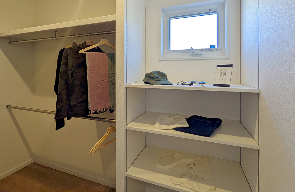 約3.0帖の広さがあるファミリークローゼット。上下2段のハンガーパイプは、ご家族の服をたくさん収納する事ができます。窓から風を通すことができ、湿気を取り除いて、大切な服をカビや虫の害から防ぐことができますよ♪