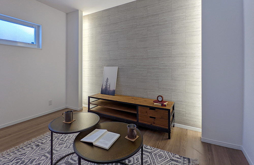 タイル調のアクセントウォールに、両サイドからタテにレイアウトした間接照明が優しく照らすリビング。上品で優しい光は、家族の団らんの時間を落ち着いて過ごせ、自然と会話も弾みます。またリビングの天井高さを上げたことで、リズム感のある空間の広がりも演出しました。