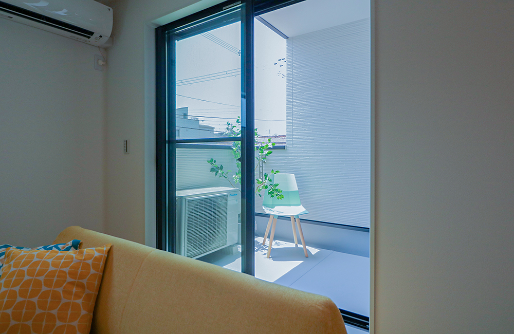 2階リビングに面した、南向きのバルコニー。陽当たりも良く、洗濯物が乾きやすいのが特長です。夏にはビニールプールを出して、小さいお子様の水遊びもできます。キッチン側に設けた採光窓からは、洗濯物を干している時の突然の雨や、バルコニーで遊んでいる子供の様子もわかるので、安心して使えます。