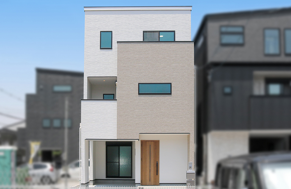 大人可愛いをコンセプトにした、外観デザインは、爽やかなホワイトをベースに、グレージュカラーのテクスチャーを組合せました。また明るい色でまとめた内装には、ブルーグレーのリビングドアや、チョークで自由に描き消しができる黒板タイプのアクセントクロスを使用し、毎日を楽しく過ごせるようにこだわりました。