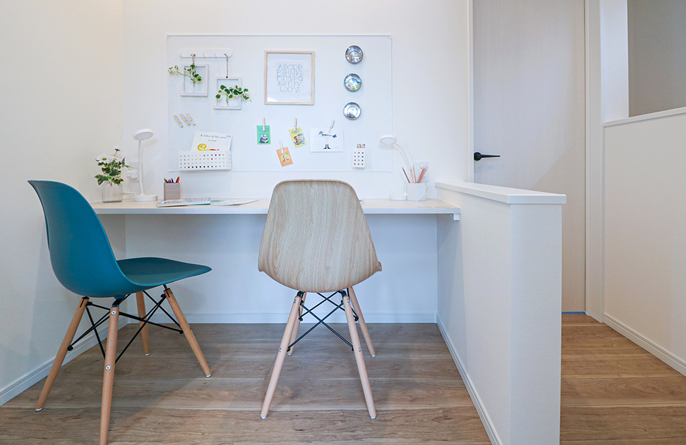 3階ホールに設けたスタディコーナーは、階段を通じて2階にいる家族と、コミュニケーションを取り合うことができます。子どもの勉強机や、洗濯物のアイロン台として、またリモートワークにも使えるスペースです。壁に設けたマグネットボードは、壁を傷付けずに、家族の連絡ボードや、思い出の写真を飾ったりと、色々な使い方ができます♪