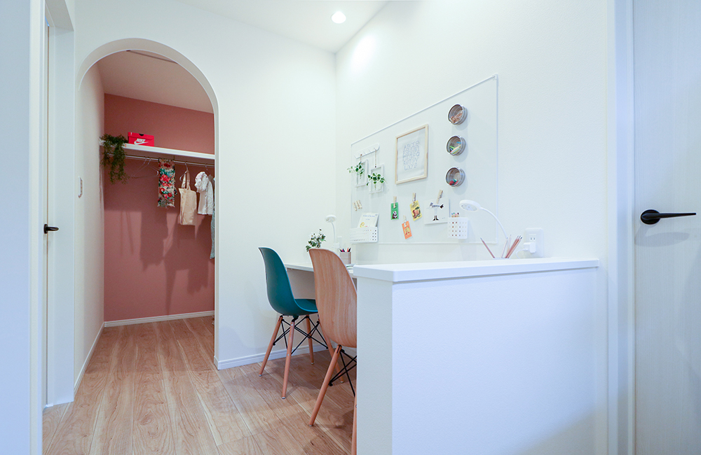 スタディコーナーのすぐ横に、アール型の垂れ壁でゆるく仕切った、かわいいファミリークローゼットを設けました。家族の洗濯物を取り込んだ後、まとめて1カ所に収納できるので、わざわざ部屋ごとに仕分けして、持っていく必要がありません。日々の家事にかかる時間と負担が減って、自分の時間が増えそうですね。