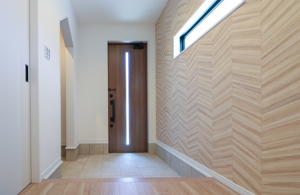 ご家族や来客を出迎える玄関ホールの壁には、ナチュラルな雰囲気の木目のヘリンボーン柄で、おしゃれに仕上げました。あえて扉を設けずに、三角垂れ壁で隔てた、シューズクローゼットは、ご家族の靴だけではなく、ベビーカーやアウトドアグッズなども、スムーズに収納できるゆとりのスペースです。