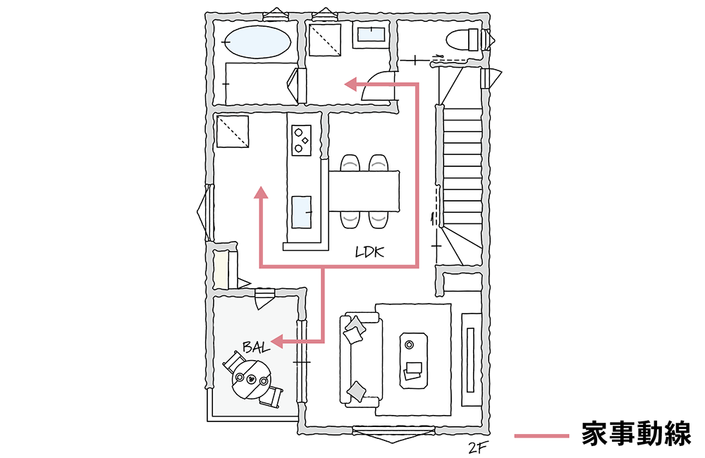 毎日のお料理や洗濯といった家事がラクになり、時短につながるように、水廻りを2Fにまとめました。洗面室とバルコニーを同じフロアにすることで、重い洗濯物を持って、階段を上り下りする事なく「洗う」→「干す」の洗濯作業がスムーズに。またキッチンでの料理や洗い物をしながらの「ながら家事」もできるので、増えた時間でコーヒーを飲みながらインスタをしたり、テレビを観たりと、自分時間を楽しむことができます。