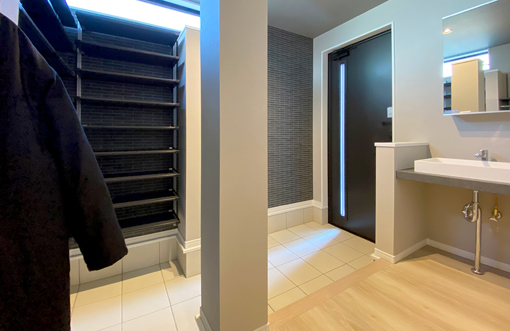 玄関ホールには、自然と手洗い習慣が付く、オシャレに造作した独立洗面台。ベビーカーをわざわざ畳まずに出入りできる玄関ホールは、家族用と来客用を分けられる2WAY仕様。家族用の玄関側には、靴の収納やコートやカバンを掛けるハンガーパイプも付いているので、毎日の整理整頓もバッチリです。