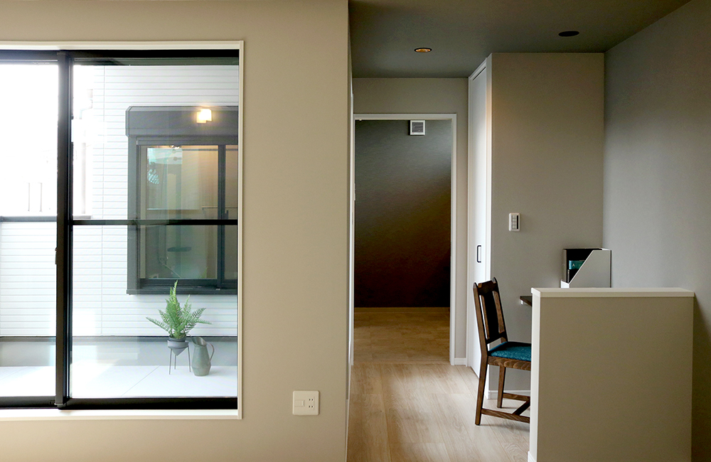 リビングの一角に、腰壁でゆるく区切ったスタディカウンター。リビングにいる家族の様子を感じながら、仕事や趣味ができる空間になっています。後ろはパティオになっているので、テレワークのWeb会議でも、室内の生活感を気にする必要がありません。また横の収納にPCや書類・掃除道具などを片付けられ、スッキリとしたLDKを保てます。