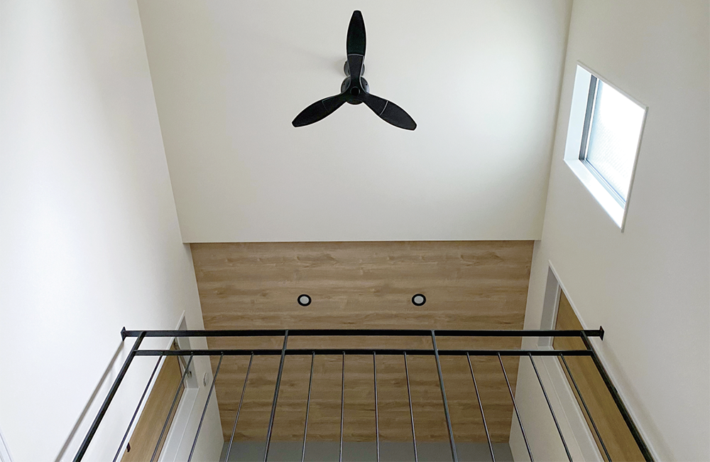 ダイニング上は吹抜けになっており3階の窓から明るい光が降り注ぎます。家族との食事や会話を楽しむ大切な場所だからこそ、明るく開放的に、自然と家族が集まるような気持ちのいい空間を目指しました。吹抜けに面した3階の廊下にはアンティーク感のある縦格子のアイアン手すりを採用し、開放感がありながら引き締まった雰囲気になっています。