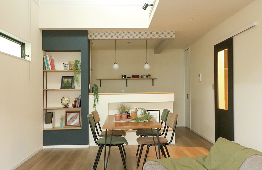 ダイニング横には、収納棚と飾り棚を設けました。可動式の収納棚には、お部屋にぬくもりを与えてくれる木材を使用しました。収納する物に合わせて高さを変えることができるので、子どもの絵本や、リビングまわりの小物など様々な物を収納することができます。収納する物に合わせて高さを変えることができるので、子どもの絵本や、リビングまわりの小物など様々な物を収納することができます。飾り棚には観葉植物を飾ったり、お気に入りのアートなどを飾ると、お部屋のおしゃれ度がグッとアップして、毎日の暮らしがもっと楽しくなりそうです♪