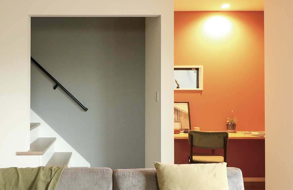 家族が集まって食事をしたりテレビを観ている時も、それぞれが好きな場所で好きなことをしている時も、家族の気配を感じながらお互いがリラックスして過ごせる居場所がある。そんなお家ができました。よく晴れた休日の昼下がり。ダイニングでゆっくり紅茶を飲みながら今日の晩御飯の参考にレシピ本をめくるママと、リビング横のスタディカウンターで真剣な顔をして調べごとをしているパパ。子供たちが上の階で楽しそうに走り回って遊んでいる声が、吹抜けから聞こえてきて、思わず目が合い微笑むママとパパ。バルコニーから光を取り込み、明るい3階の洋室は子供の遊び場にもぴったりです。吹抜けから明るい光が降り注ぐダイニングや、家族みんなで使えるスタディコーナーなど、どの場所にいてもお互いにコミュニケーションが取りやすく、家族と程よい距離感を保つことができて、居心地のいい空間になっています。