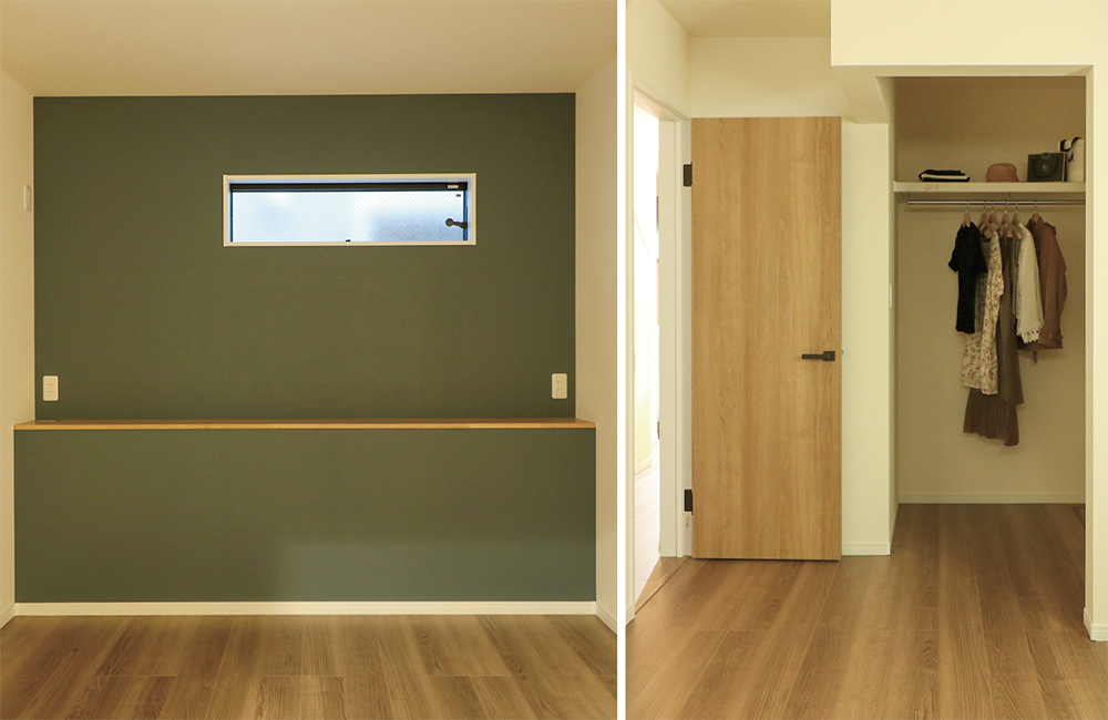 主寝室内には、垂れ壁でゆるやかに仕切ったウォークインクローゼットを設けたので、衣類を一ヶ所にまとめて収納することができ、朝の身支度を素早く済ませることができます。眠る前は、造り付けのベッドボードを背もたれにして、読書をしたり、パソコンで作業をしたり。ゆっくりくつろぎながら時間を楽しめそう♪ベッドボード上には、目覚まし時計やスマホなどのよく使う小物や、作業時に大活躍なスタンド照明を置くことができて便利です。主寝室は1日の始まりを迎える場所であり、1日の疲れを癒す大切な場所。ただ寝るだけではなく、リラックスしたり、趣味や自分の時間を楽しめる。そんな快適な空間に仕上がってます。