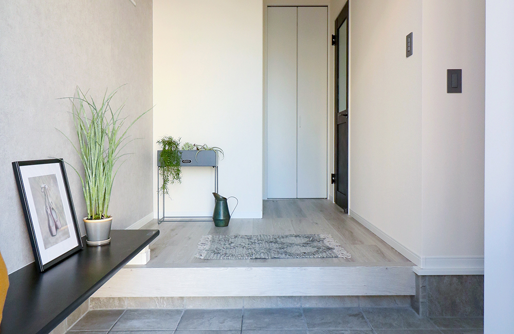 シンプルなモノが好きで、落ち着いた色味がすき。休日は家族とお家でのんびり過ごしたい、そんなあなたにオススメのグレイッシュなお家です。内装は、ホワイトのドアにホワイトオークの床、LDKはドアやキッチンの取手にブラックを取り入れ、アクセントにタイル調のクロスを使い洗練された落ち着きのあるスタイルに仕上がりました。吹抜けから光が差し込むLDKは、リラックスして家族とゆっくり過ごすことができる明るい空間になっています。玄関入ってすぐの造作ベンチや、ウォークインクローゼットに設けたドレッサスペースなど、暮らしの中であると嬉しい設備を詰め込みました。家具や雑貨で装飾をほどこし、「家そのもの」の魅力だけではなく、「住まい方」もイメージできるお家です。