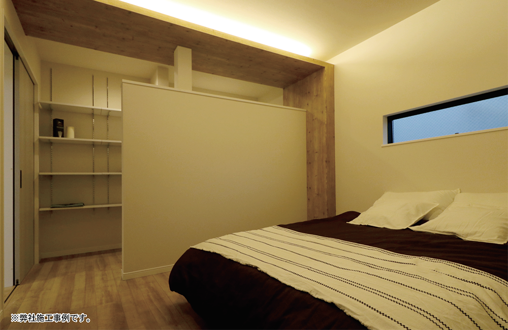 主寝室全体の照明をシーリングにして十分な明るさを確保した空間に、垂れ壁には調光可能なコーブ照明を取り入れました。朝の身支度や、お掃除の時はシーリング照明をつけてお部屋全体を明るく。眠る前のリラックスタイムにはシーリング照明を消して、コーブ照明の優しい光で落ち着いた空間になります。1日の出来事を話したりしながら、リラックスして過ごすことができ、ゆっくり眠ることができそうです。