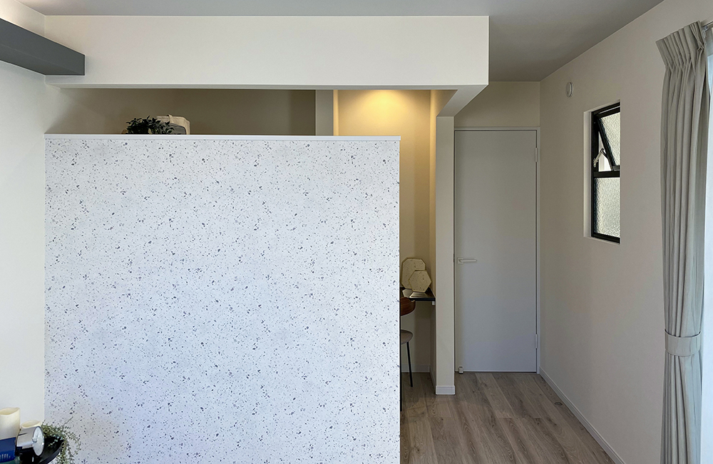 ホワイトのドアにホワイトオークの床で落ち着いた空間の中に、LDKのドアやキッチンの取手にはブラックを取り入れ、アクセントにタイル調のクロスを使いました。チェッカーガラスがおしゃれな室内窓やシンプルだけど存在感のあるグレーのスイッチ。寝室や玄関には垂れ壁を取り入れるなど、日常の中でふと目に入る細かい場所にもこだわりました。暮らしを楽しく飾るアクセントがお家の中にちりばめられています。
