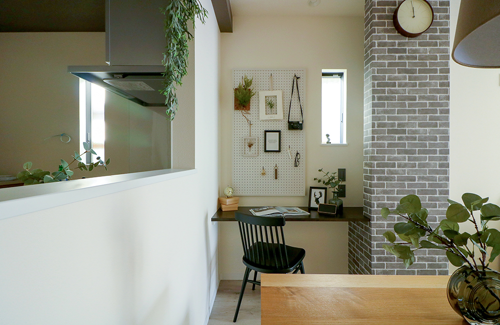 LDKの一角に設けた、スタディスペースは料理の合間にホッとひと息付けるママの家事スペースとして。リビングからは見えない収納棚を設けたので、子供の学校からのプリントや郵便物など、日々増える書類の整理場所にピッタリです。カウンター上には有孔ボードを設置しました。フックを使用して、よく使う文房具や、本を読む時に使うメガネをかけておいたり。お気に入りの小物を飾るとリフレッシュした気持ちで作業に打ち込めます。