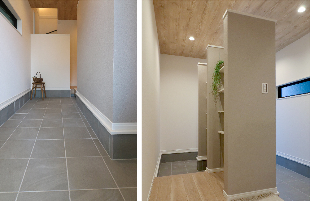 4.5帖のひろびろ玄関は、お客様用と家族用を使い分けられる2WAY仕様。シューズクロークも大容量で、ベビーカーやゴルフバッグ・アウトドア用品などもすっきり収納。お客様用玄関は細長い土間スペースになっていて、自転車やベンチ、植物を置いたり、D.I.Y.などのちょっとしたスペースにも使えそうです。