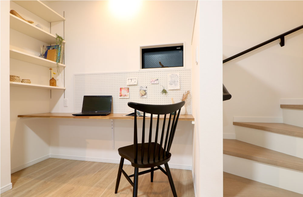 ダイニング横にスタディカウンターを設けています。自室に行きたがらない子どもの勉強や趣味のクラフト、オンライン授業やレッスン、家族みんなで使えるスペースです。造作の有孔ボードと飾り棚も付いているので、散らかりがちな書類や小物もスッキリ。お気に入りの写真や小物を飾って好きなものコーナーにしてもおしゃれですね。