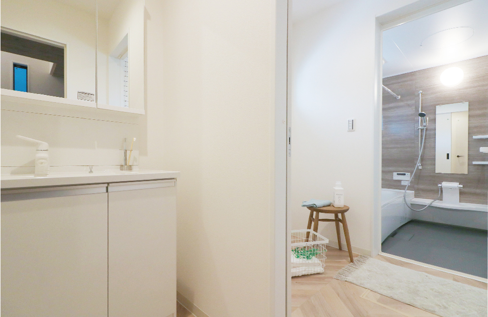 実家で暮らしていた時「誰かがお風呂に入っていると洗面台が使いづらい」と感じたことはありませんか?使用中でも気兼ねなく洗面台が使えるように、洗面室と脱衣室を分けました。どちらも1階にあるので、帰ってすぐ手洗い・うがいも出来、そのままシャワーで汚れを落とせば、リビングに汚れやウィルスなどを持ち込みません。花粉や風邪の季節にも清潔を保て、子どもたちが汚して帰ってきても安心です。