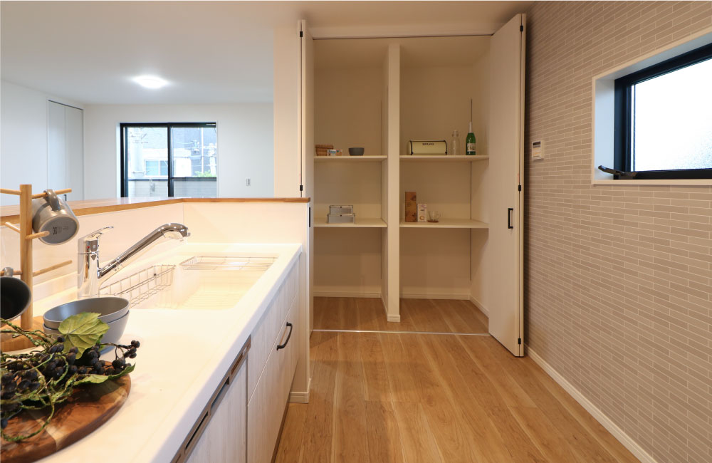 キッチン横に容量たっぷりのパントリーを用意しました。間口が大きく、可動棚になっているので、お米やペットボトルなどの重い物のまとめ買いにも対応できます。一目で見やすく、しまうことも探すこともしやすいつくりなので、買い置き食品の使い忘れがなくなり、調理スピードも上がります。ドアを閉めれば隠せてしまえるので、お部屋もすっきりと見えますね。