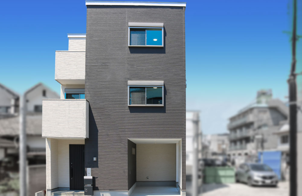 2階・3階のバルコニーの陽あたりや、建物内へより多くの光が入るように考え、間口の広い南向きの立地を生かした、階段状の個性的な外観です。カラーテイストはホワイトとグレーを組み合わせ、都会的な暮らしにマッチした、爽やかで上品な印象に仕上げました。