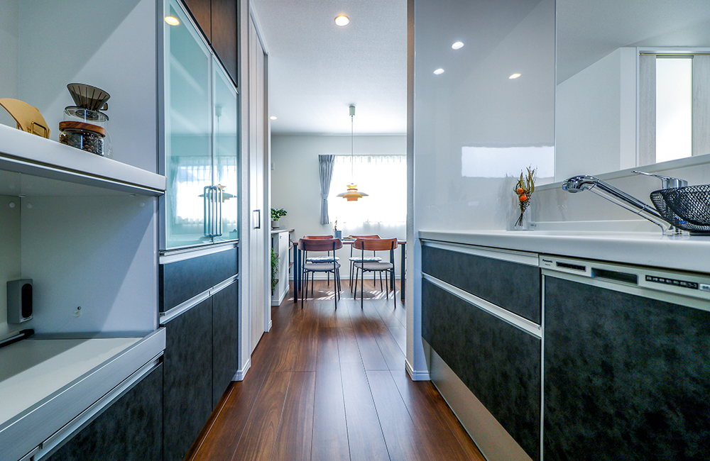 木目柄の折下げ天井でゾーニングしたキッチン。背面に設けたカップボードは、電子レンジや炊飯器などの家電や食器を置けば、振り返るだけでサッと使え便利です。またキッチン横のパントリーには、まとめ買いした食料品のストックや、食器・調理器具の保管など、キッチン周りのアイテムを一か所にまとめて収納できます。