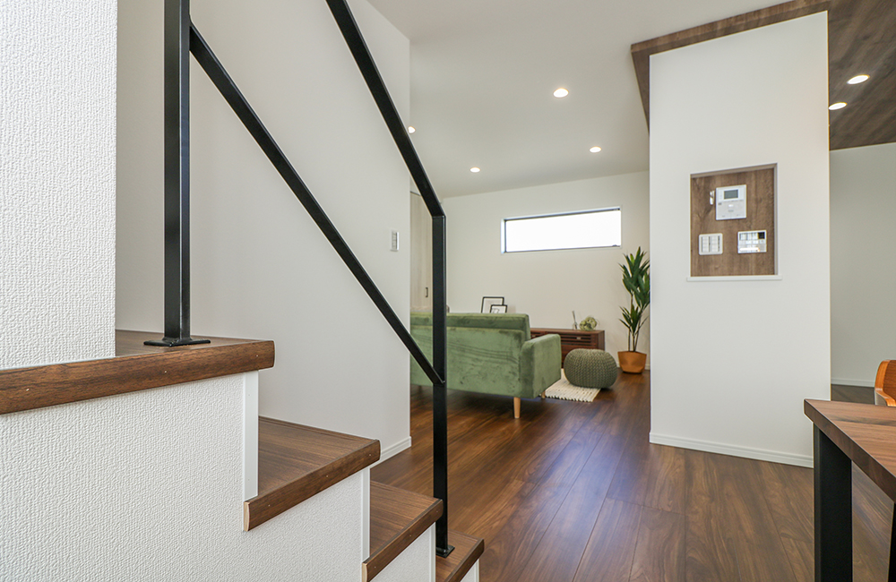 2階のLDKには、アイアン手すりがオシャレなひな壇のリビング階段を設けました。階段自体がインテリアの一部となり、リビング空間に広がりや、彩りをプラスしてくれます。また3階の部屋へ行く時には、必ずリビングを通るので、自然とご家族間のコミュニケーションが増えます。