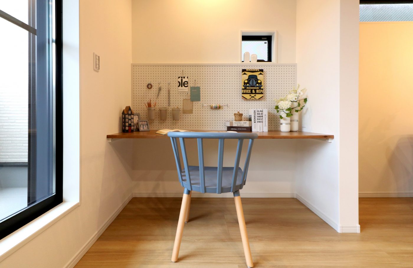 バルコニー横のひろびろスタディカウンター。居心地が良いのはもちろん、60×168cmと通常より広いカウンターでPC作業もはかどります。有孔ボードがついてるのでフックを使用して、よく使う文房具やメガネをかけたり、写真やチケットもおしゃれにディスプレイ。バルコニー横なので、取り込んだ洗濯ものをたたんだり、アイロンをかける家事スペースとしても便利ですね。