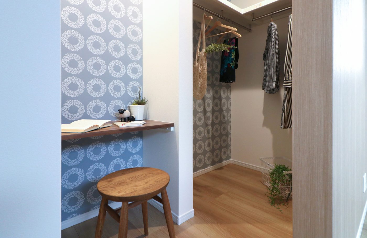 主寝室のウォークインクローゼットに、ドレッサーやちょっとした書き物ができるスペースを設けました。北欧風の壁紙がかわいい、小さな小部屋のような空間です。1日の終わりにお気に入りのスペースで、くつろぎのお手入れタイムや読書に。朝のあわただしい時間も、さっと身支度ができます。