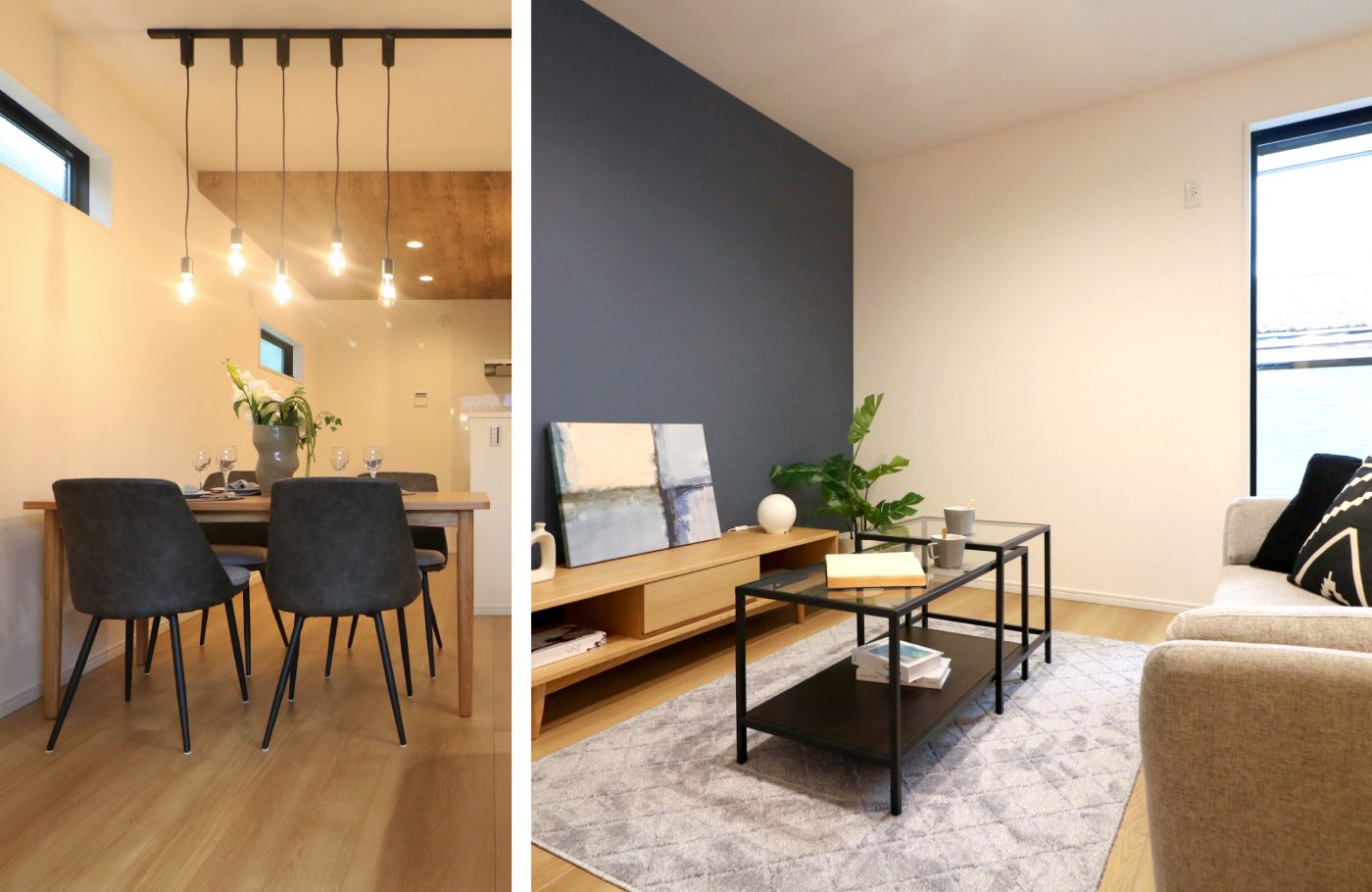 白と木目を基調にアクセントカラーにネイビーブルーを使った、ナチュラルでおしゃれなデザイン。折り下げ天井を施したダイニングキッチンは、LDKのアクセントとして空間を彩ります。ダクトレールにはスポットライトが設置してあり、お店のようなインテリアも楽しめます。