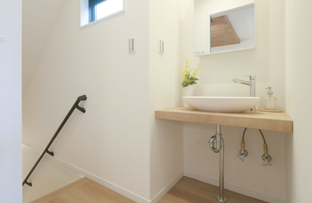 2階階段を上ったところ、リビングの入口前に洗面台を設置しました。帰宅時部屋に入る前や、階段の上り下りの際にも手洗い・うがいを行え、「新しい生活様式」にも対応しています。朝の身支度も1階まで下りずにできるので、朝のバタバタや混雑も解消できます。