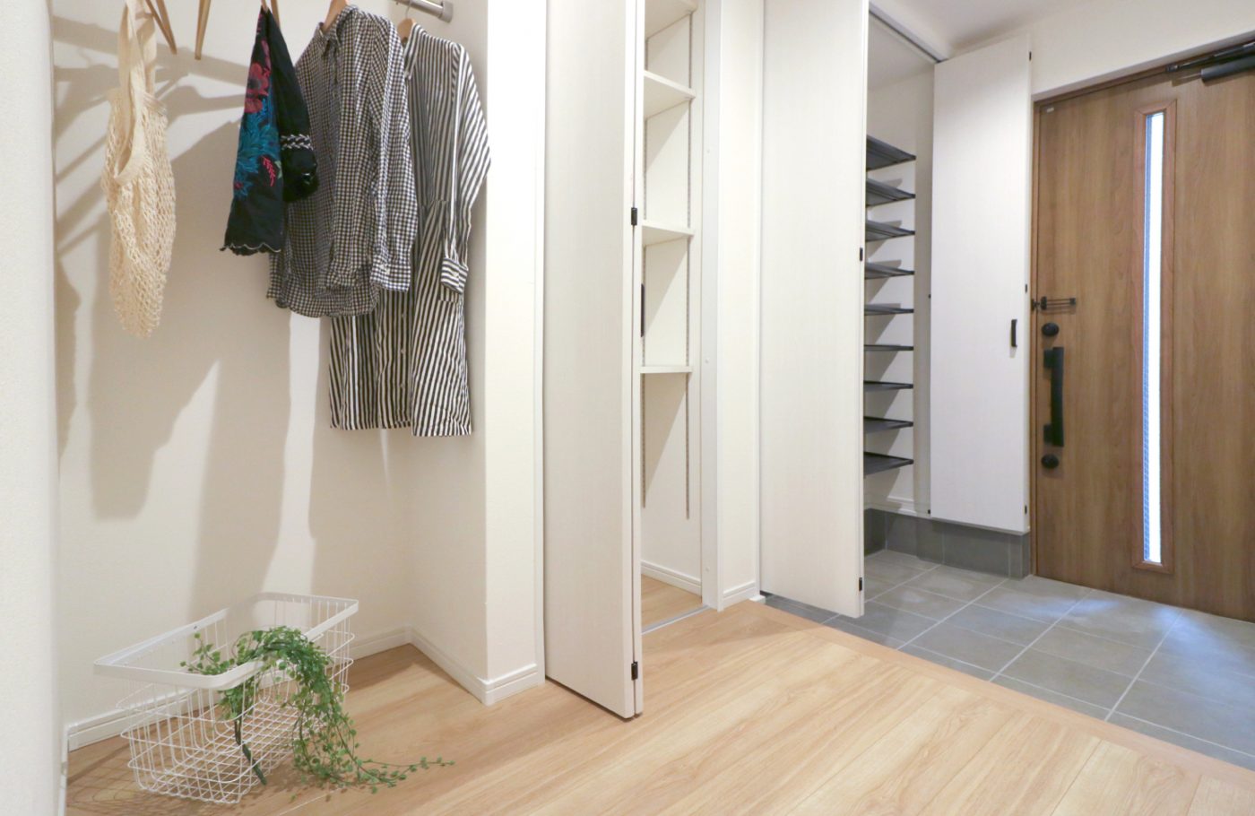 よく使う場所に収納場所があることで、細かい時短ができ、貴重な時間を拾い集めることができます。例えば玄関、シューズクローゼットの他に、クローゼットとハンガーがあり、外出時に使うもの(コートや帽子、だっこ紐 等)をしまうことができます。また、収納場所に迷うもの、Wifiルーターや掃除機の充電などの収納場所を用意しました。適材適所に収納があることで、空間もすっきりし、時短ができます。