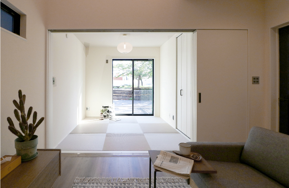リビング横には、オシャレな琉球風畳の4.5帖の和室を設けました。取り込んだ洗濯物を畳んだり、来客時には扉を閉めれば、客間としてお使いいただけます。キッチンからも見える位置にあるので、子どもがおもちゃ遊びやお昼寝をしていても、家事をしながら子供の様子を伺うことができて安心ですね。