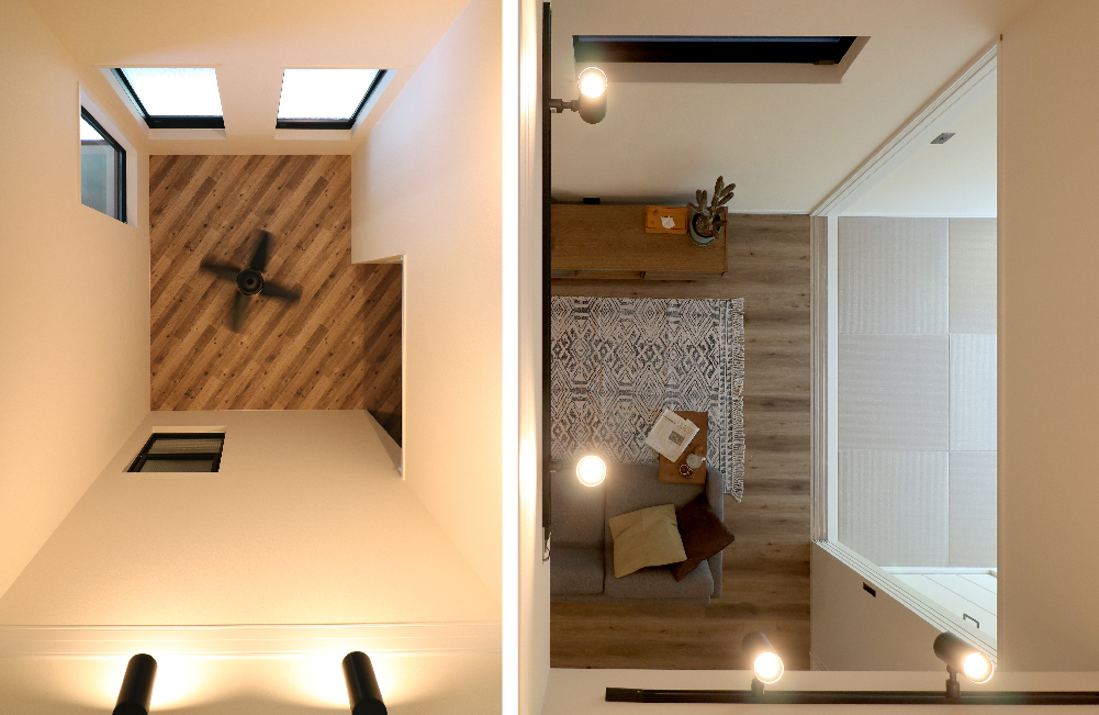 お家の真ん中に位置するリビング上部に、柔らかい光が取り込める開放感あふれる吹抜けを設けました。吹抜けは2階の廊下や主寝室の室内窓とつながっていて、違う場所で過ごしていても自然と家族の気配を感じられます。1階から「ごはんできたよ~」と呼べば「はーい」と返ってくる、家族のつながりを大切にできるつくりです。