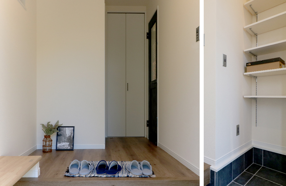 ちょっと履きにくい靴とかありますよね?そんな時に便利な造作ベンチです。上がってもらうほどでもない短い時間の来客時や、買い物や宅配のちょっと置きにも活躍してくれます。シューズクローゼットは、垂れ壁で仕切られているので、ロールスクリーンなどで隠してしまえばスッキリと見せられ、傘やベビーカーなどの外で使うものもそのまま収納してしまえます。