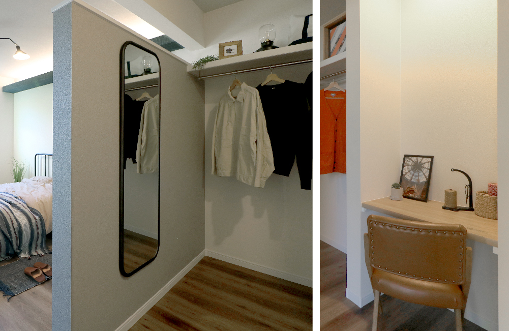 主寝室内に、腰壁と垂れ壁でゆるりと区切ったウォークインクローゼットと、ワークカウンターを設けました。朝はクローゼット内でコーディネイトを決めて、カウンターでメイクや髪を整えて、お出かけ準備も簡単になります。夜は眠るまでに、PCで明日のスケジュールを確認したり書類を整えたり、書斎代わりにもなる、便利な半個室の空間です。