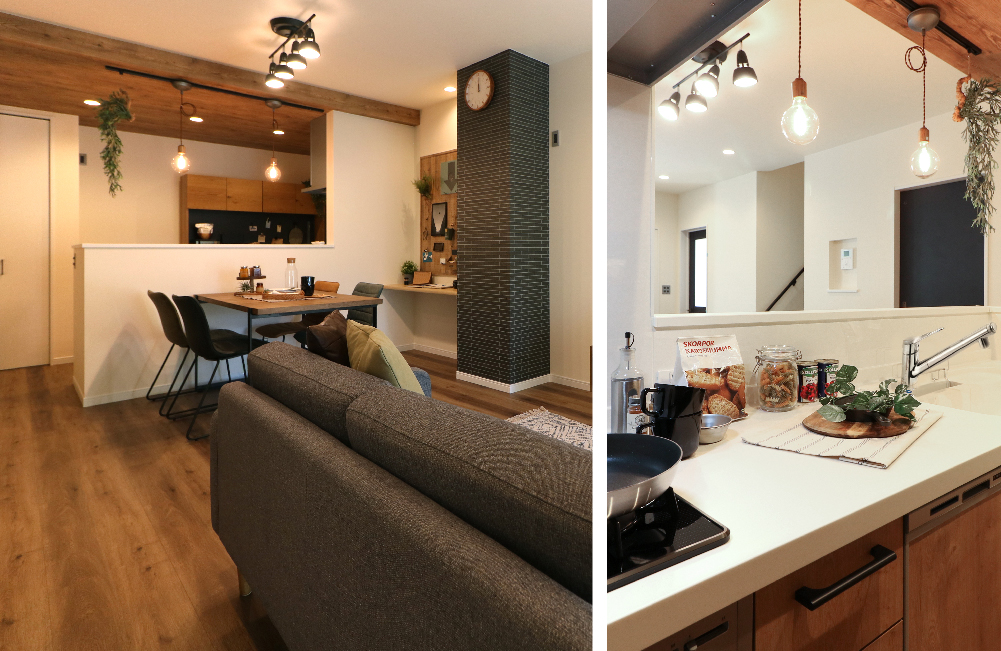 ユニークで古びた、温かみのあるものがすきで、ネイビーやブラックなどメリハリのある色が好き。そんなあなたにオススメのナチュラルヴィンテージのお家です。外観はダークブラウンをベースに木目をアクセントでかっこよく。内装は、ネイビーのドアにナチュラルオークの床で温かみのある心地の良い空間です。毎日の家事が楽しくなるおしゃれなキッチンはカフェや雑貨好きにはうれしいデザイン。ダイニング横のスタディカウンターや家族で共有できる吹抜け空間など。家族がつながれることを大切にしたお家になっています。家具や雑貨で装飾をほどこし、「家そのもの」の魅力だけではなく、「住まい方」もイメージできるお家です。