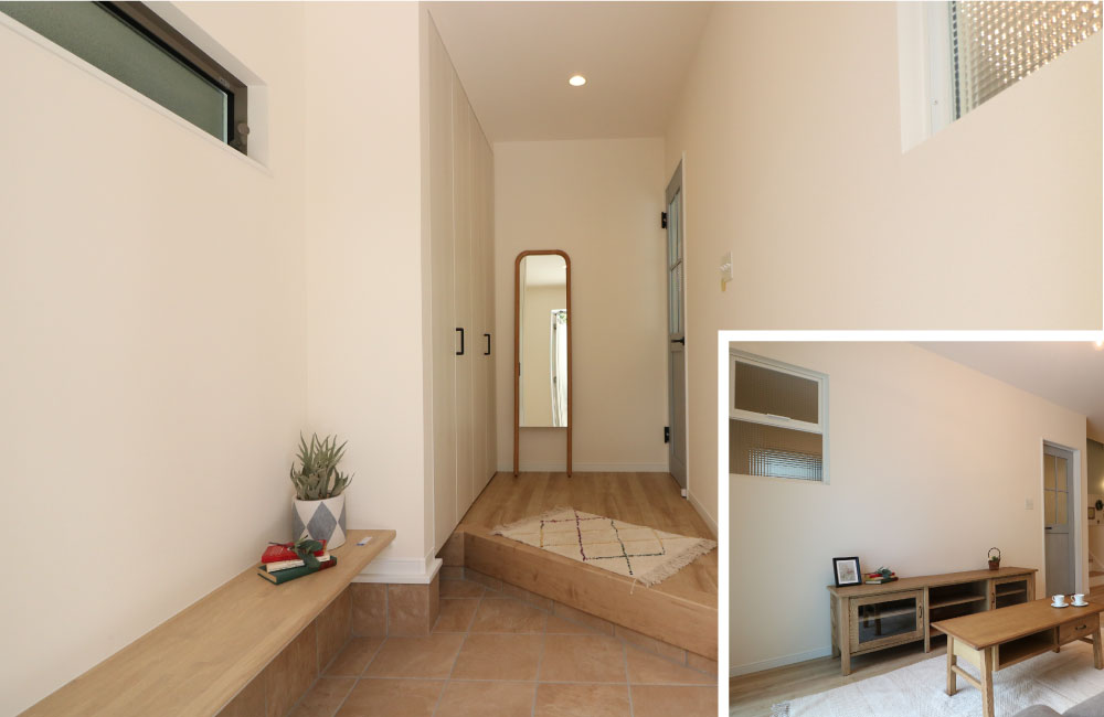 白を基調にやさしいブルーのドアにメープルの床、リビングに通じる室内窓にはチェッカーガラスをあしらって、お客さまをやさしい雰囲気でお迎えできる玄関。造作のベンチでは、子どもと並んで靴を履いたり、帰宅時には荷物を置いたり、宅配の受け取りもスムーズにできます。ちょっとした来客とも玄関でついつい長話ししてしまう、そんな空間です。