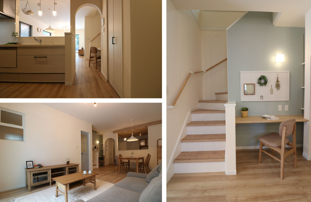 少しシャビーであたたかみのある色いと素材を集めました。やさしい色合いと木の風合いで、毎日を心地よく過ごせます。室内窓やR垂れ壁、チェッカーガラスや折り上げ天井など、デザインにこだわった内装は、住むほどに愛着を持っていただけます。