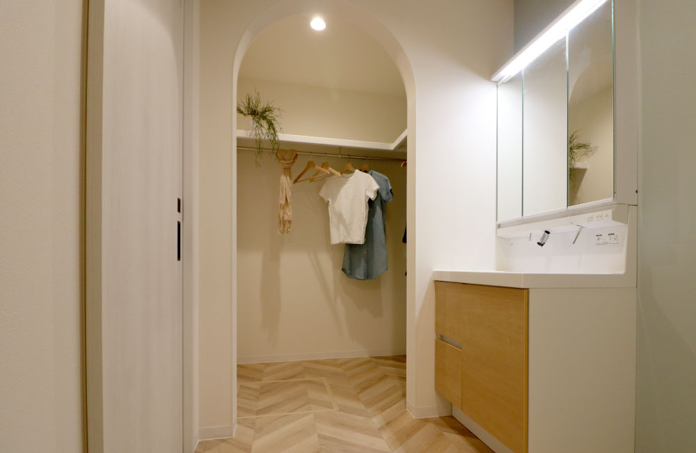 1階脱衣所の横にウォークインクローゼットを設けました。浴室乾燥機を使えば、一歩で洗濯→収納を完結することができます。パジャマや子ども服・下着にタオルなど、お風呂上がりに使うものや洗う頻度が多いものを置いておけば、毎日の家事がラクにすみます。入口のR垂れ壁やヘリンボーンの床のおしゃれな空間は、めんどうな洗濯の時間も楽しい時間に変えてくれるはずです。
