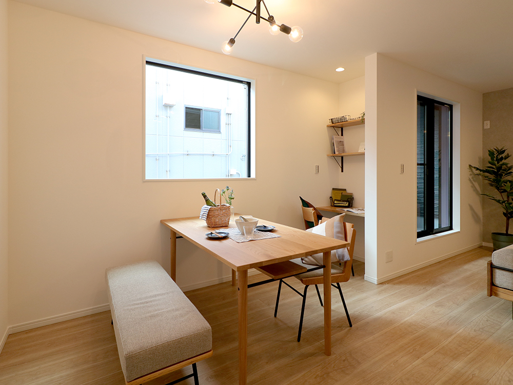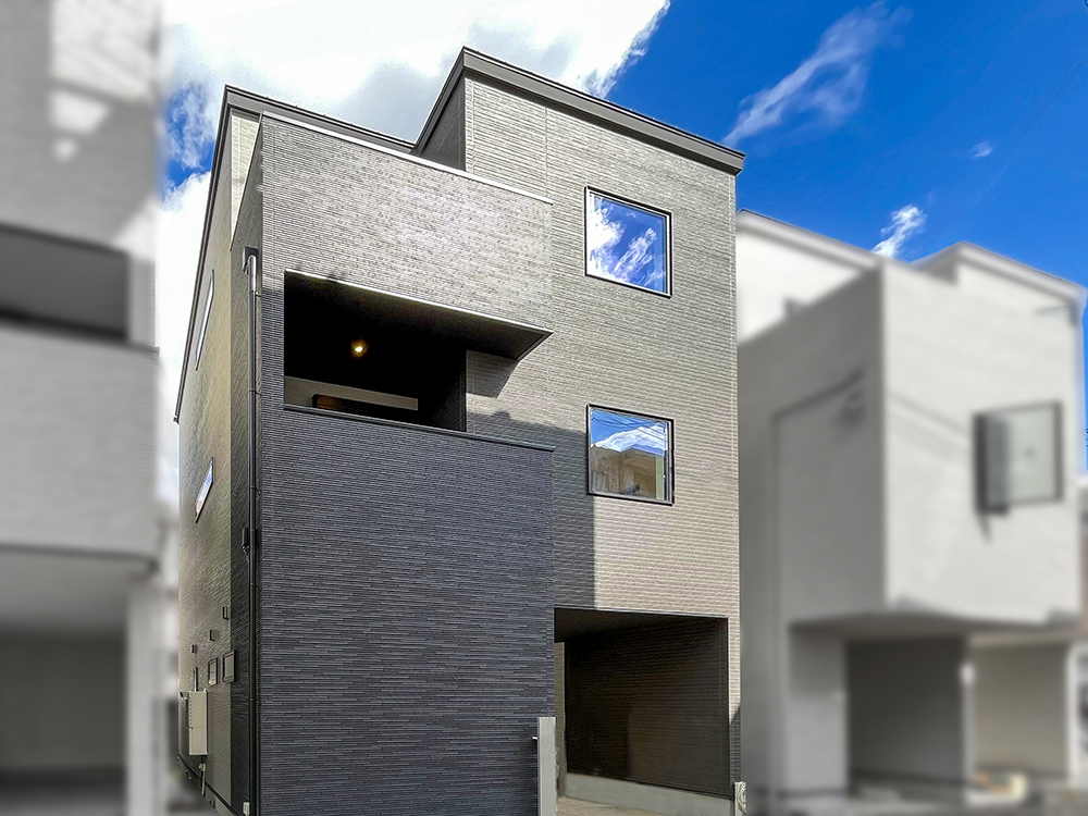南に面したバルコニーを備え、各部屋に収納を設けたゆとりのある4LDKの家が完成します。2階にリビングを配置することで、外からの視線を避けることができ、プライバシーの確保にもつながりました。カーテンや窓を開けて、自然の光や風の通るリビングでのびのびくつろいでいただけます。キッチンのパントリーや、各部屋に十分な収納スペースも確保しているので、お家の中はいつでもスッキリ。また、水廻りの動線や、ポーチから玄関ホールまでの人感センサーなどやさしい気配りがうれしい設計となっています。グレーを基調としたシックな外観と、クールで都会的な落ち着いたイメージの内装はいつまでも飽きることなく過ごしていただけます。