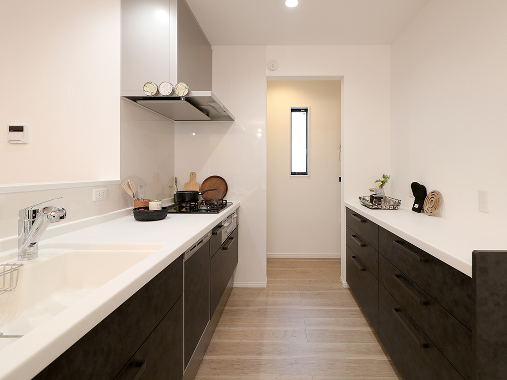 南面にバルコニー設け、キッチンとダイニングにたくさんの光を取り込める、陽当たりと風通しが良くなる快適な住空間を実現できるように工夫しました。広く明るいLDK空間が取れるような配置に苦労しましたが、各居室の広さと適材適所の収納量をしっかりと確保。キッチン奥には容量豊富なパントリーも設置しました。グレーを基調としたシックな外観と、都会的な落ち着いたイメージの内装にしました。いつまでも飽きることなくご家族の時間を過ごしていただけることと思います。